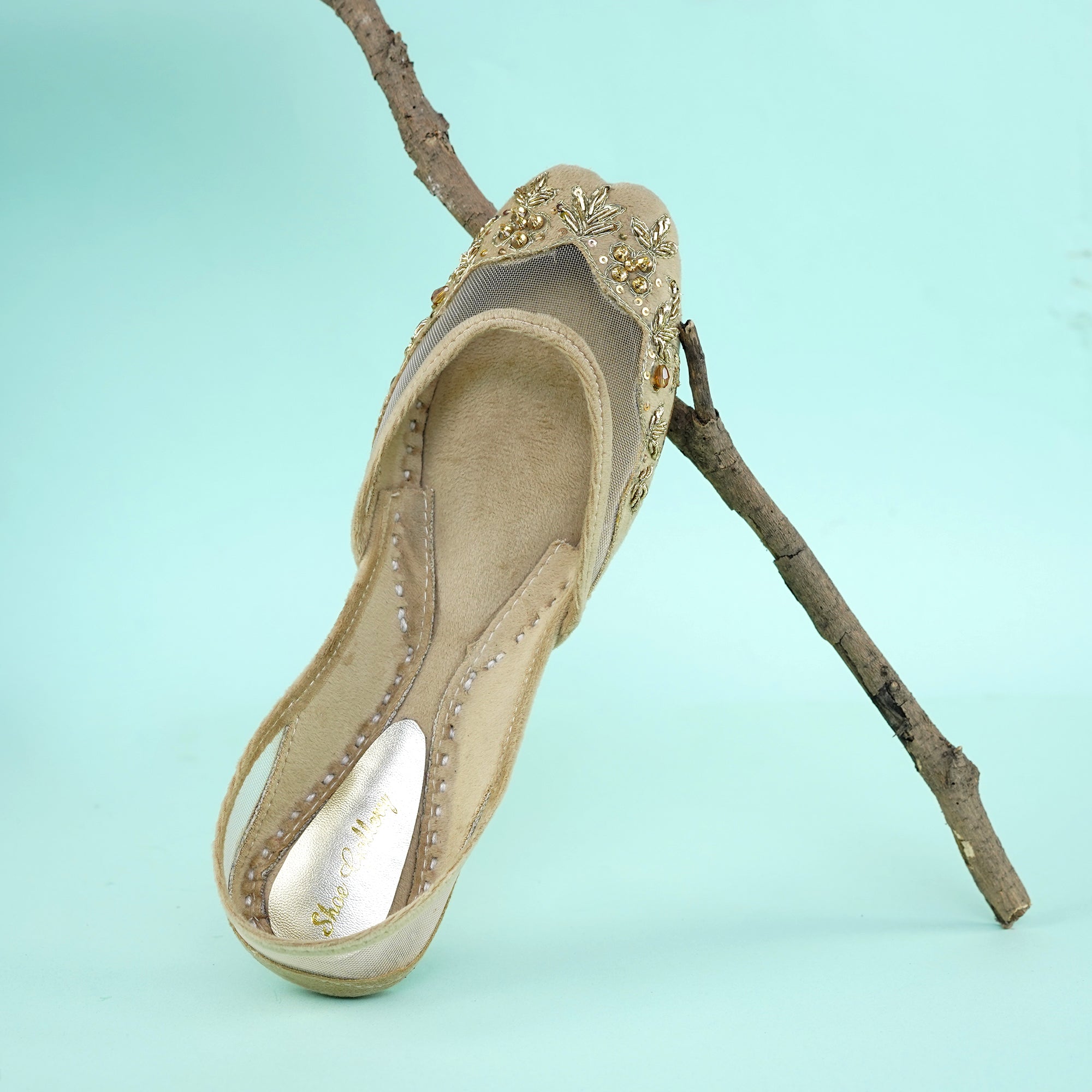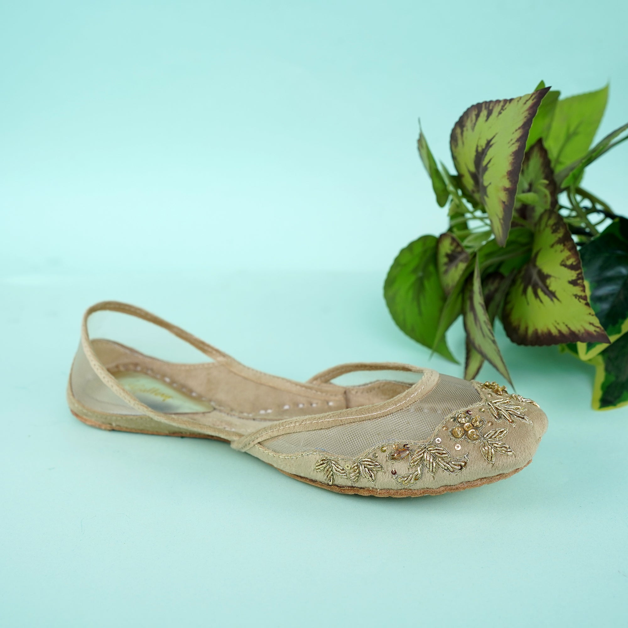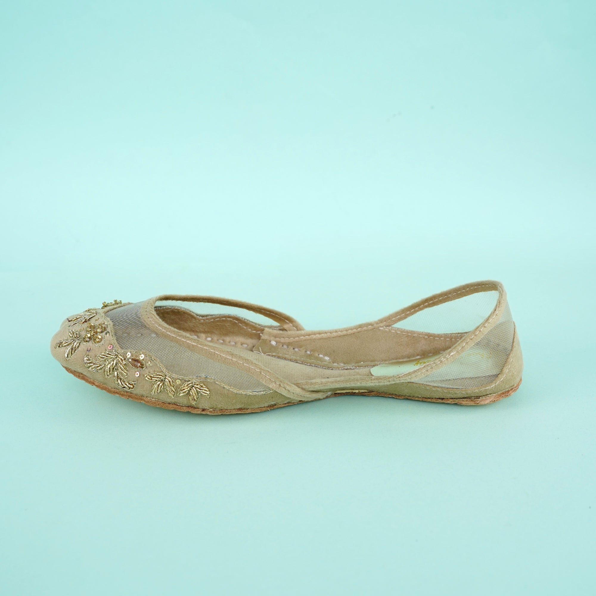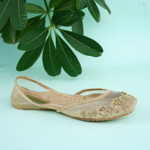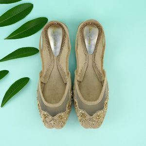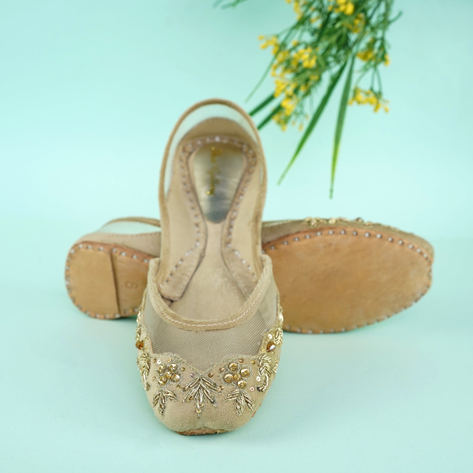 Add a hint of sophistication to your look with our Golden Grace Embroidered Beige Juttis, a perfect blend of tradition and luxury. These handcrafted juttis feature a soft beige base with delicate net detailing and intricate golden embroidery adorned with tiny beads and sequins — creating a look that’s effortlessly graceful and versatile.