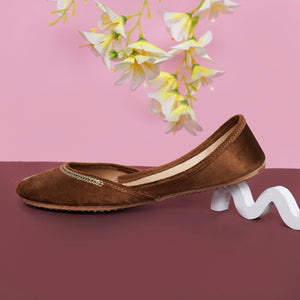 Bring a touch of classic charm to your style with our Classic Brown Velvet Juttis, designed for effortless elegance and comfort. These handcrafted juttis feature a rich brown velvet finish, adorned with subtle golden thread detailing along the edges for a sophisticated look.