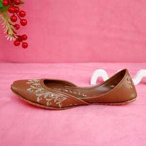 Elevate your ethnic look with our Golden Swirl Brown Juttis, a timeless combination of sophistication and traditional artistry. These handcrafted brown juttis feature exquisite golden thread embroidery in elegant swirl motifs, adding just the right touch of sparkle to your festive or everyday wear.