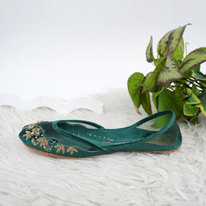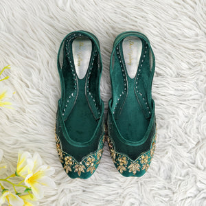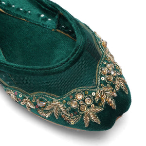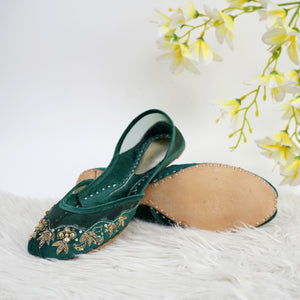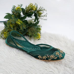 Add a regal touch to your festive look with our Emerald Elegance Juttis, beautifully crafted in deep green velvet with intricate golden embroidery and bead detailing. These juttis exude luxury and sophistication, making them the perfect choice for weddings, festive occasions, and traditional celebrations.
