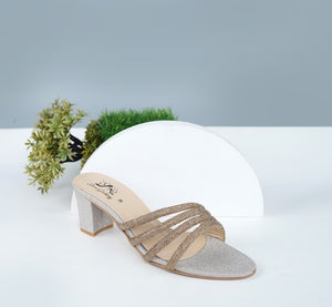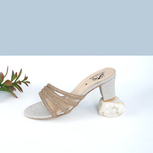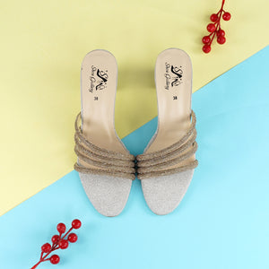 Add a refined touch of glamour to your wardrobe with this stylish slip-on sandal, crafted for elegance and comfort. The sandal features a sparkling silver base with a rounded open toe, offering a chic yet timeless appeal. The standout detail lies in its multi-layered strap design, made of metallic gold beaded cords artistically intertwined at the center. This layered effect creates a bold and luxurious look, perfect for special occasions.