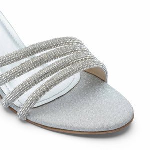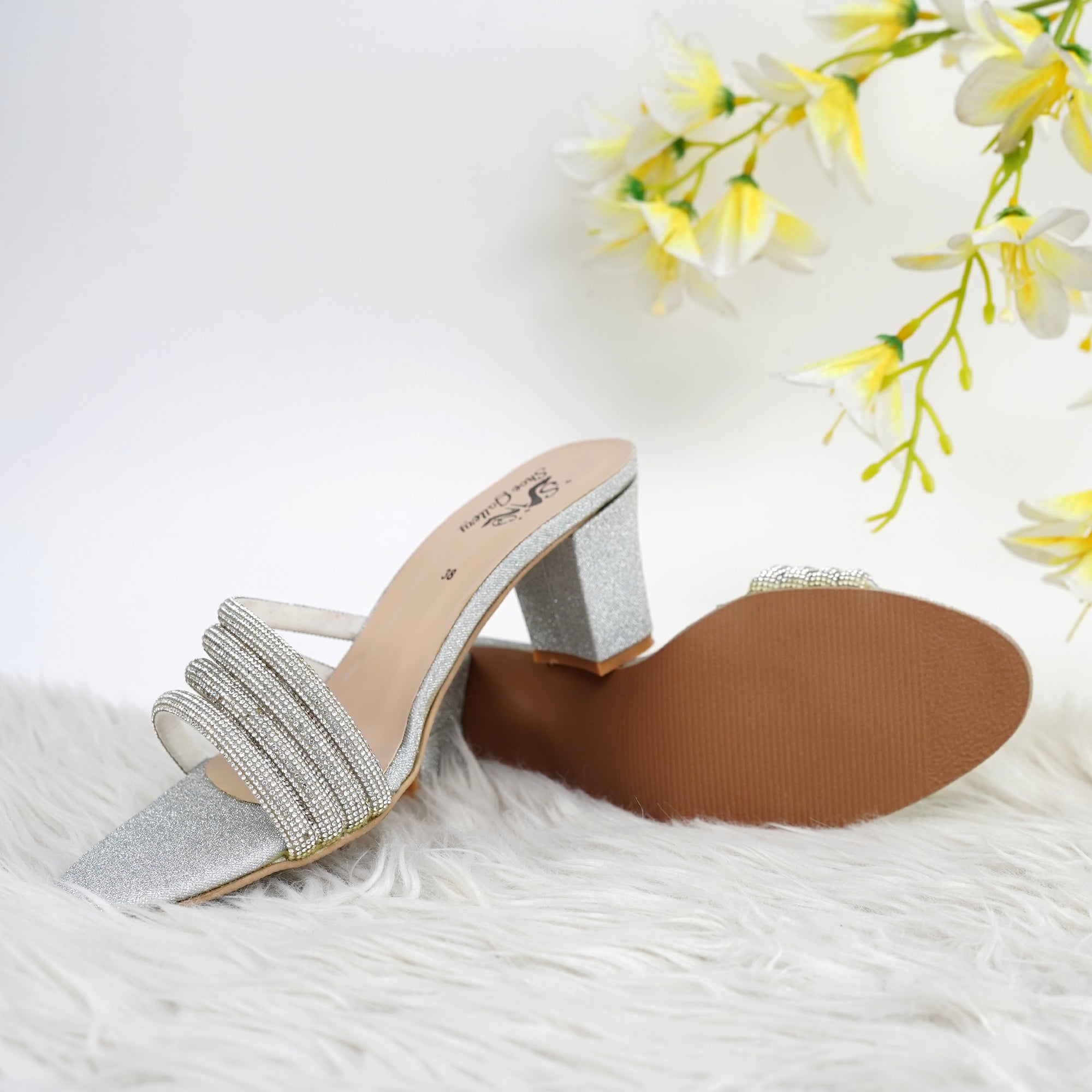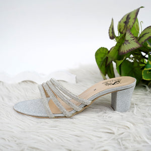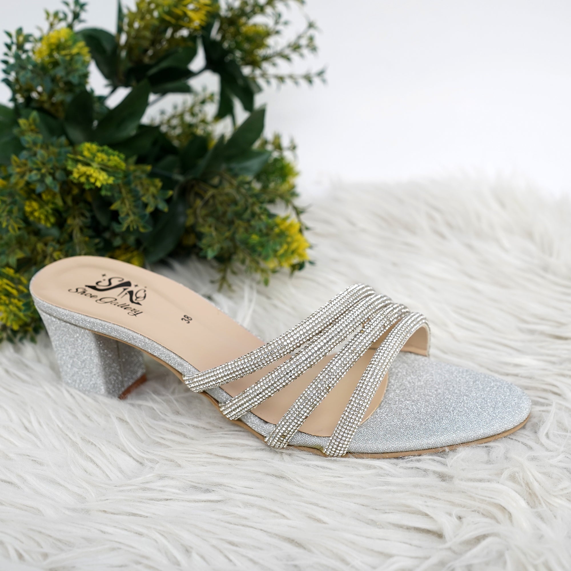 Step into sophistication with our Silver Sparkle Heels, designed to make you shine effortlessly. These elegant slip-on heels feature crisscross shimmer straps embellished with delicate bead detailing, giving your outfit a touch of luxury and grace.