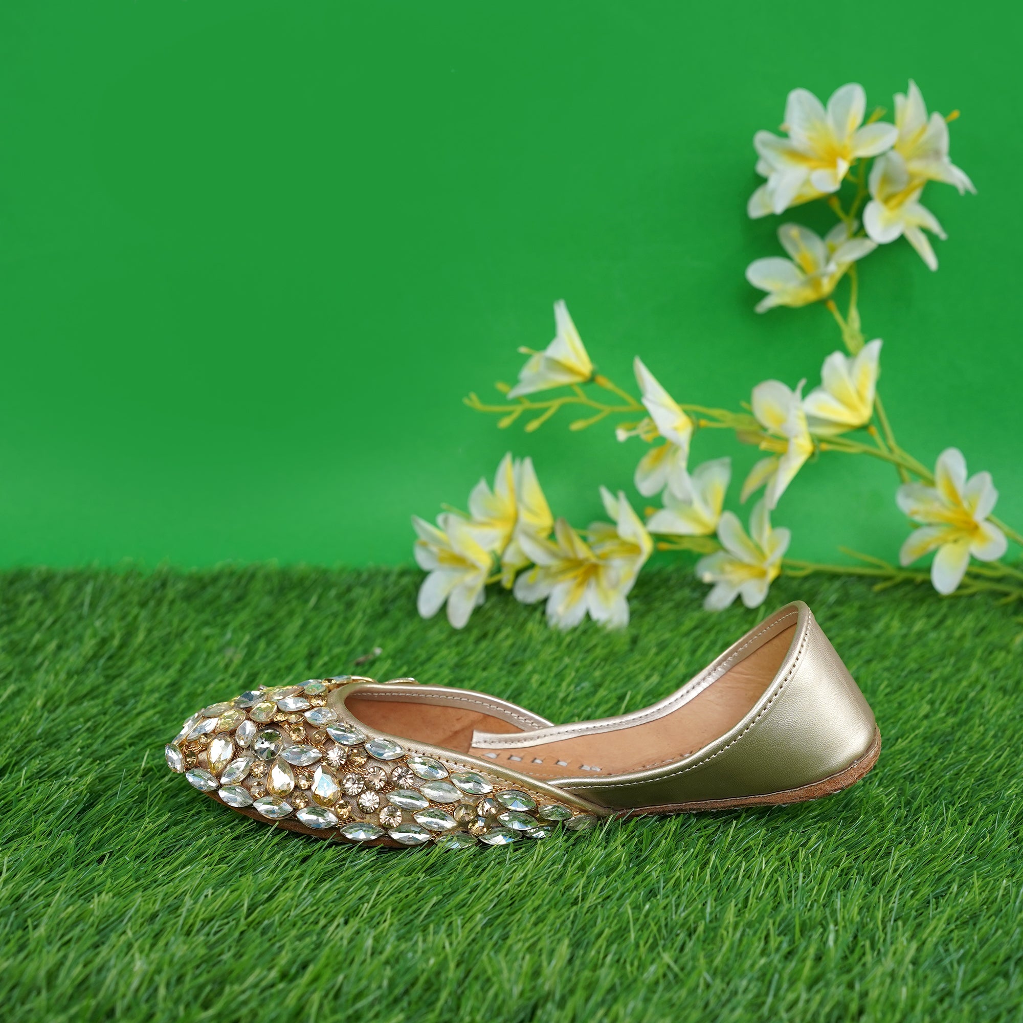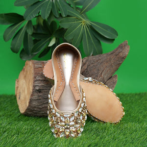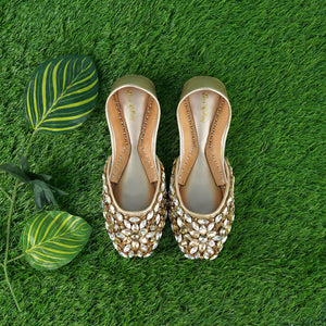 Step into pure elegance with our Golden Radiance Juttis, a masterpiece of luxury and tradition. Adorned with intricate hand-embellished golden stones arranged in a floral pattern, these juttis bring the perfect sparkle to your festive and wedding looks.