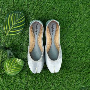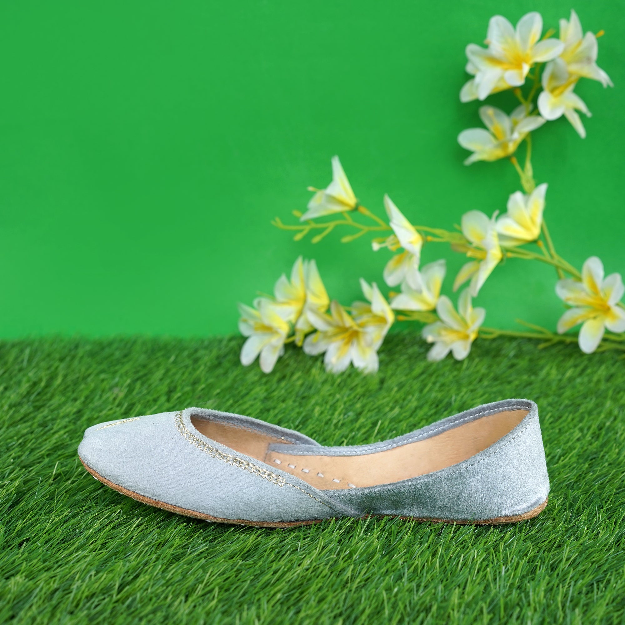 Step into subtle sophistication with our Silver Mist Classic Juttis, designed for women who adore effortless elegance. Featuring a soft silver-grey suede finish with a delicate golden stitch accent on the toe, these handcrafted juttis are the perfect blend of modern minimalism and traditional charm.