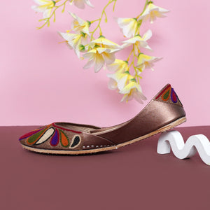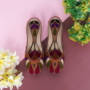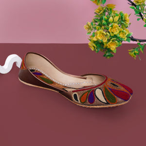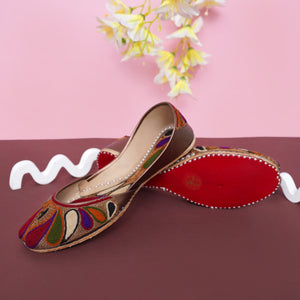 Add a touch of tradition and color to your wardrobe with our Multicolor Traditional Embroidered Juttis. Beautifully handcrafted, these juttis feature intricate embroidery in rich tones of maroon, purple, green, and gold — creating a stunning, eye-catching pattern that complements both ethnic and contemporary outfits.