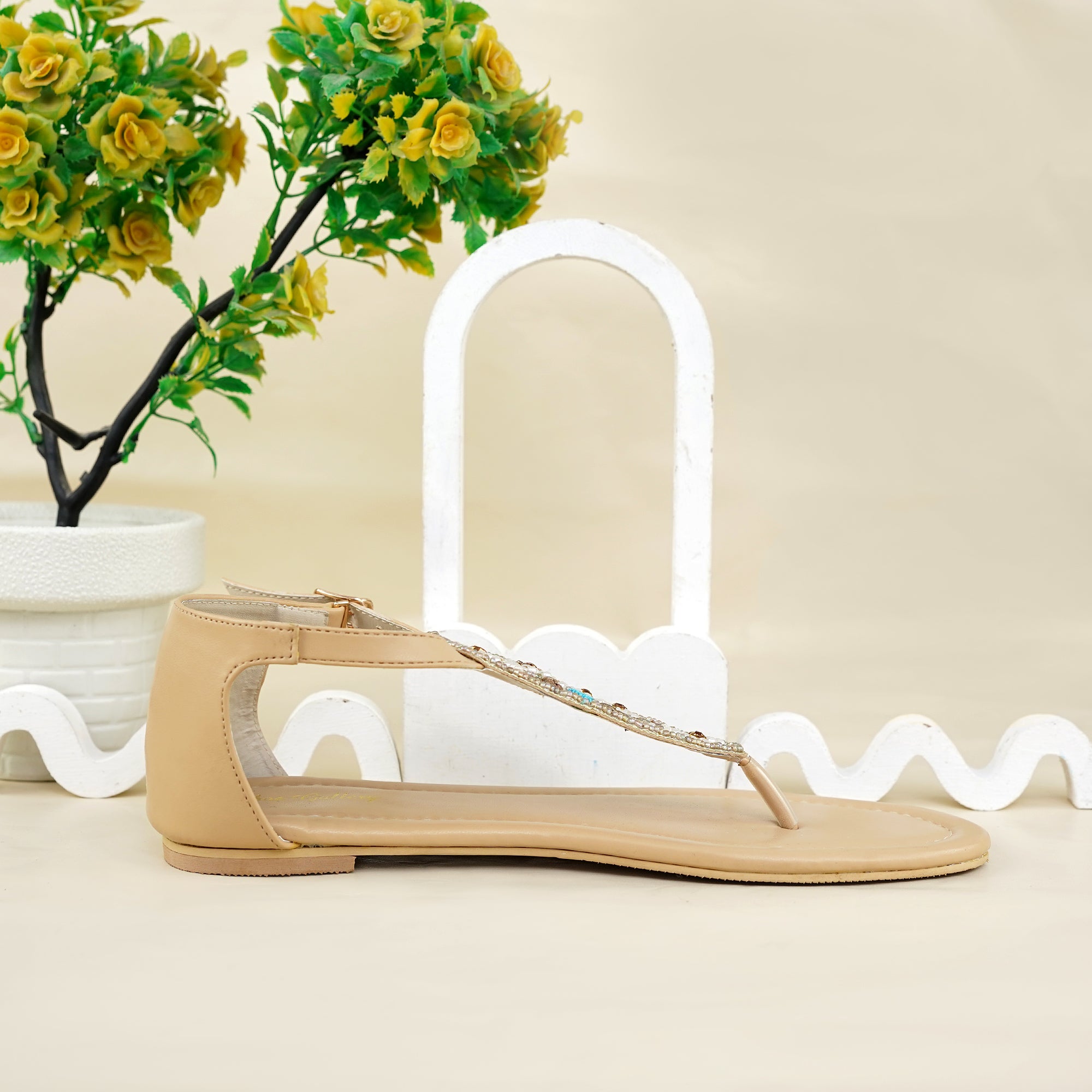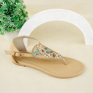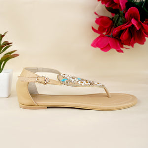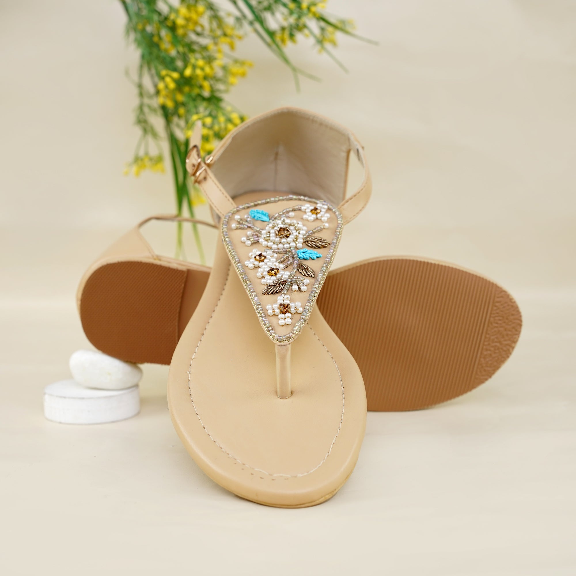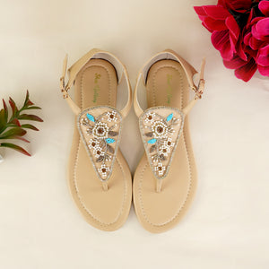 Elevate your everyday style with our Beaded Beige T-Strap Sandals, a perfect blend of elegance, comfort, and craftsmanship. Featuring delicate beadwork with floral patterns in pearl white, gold, and turquoise accents, these sandals add a subtle sparkle and charm to any outfit.