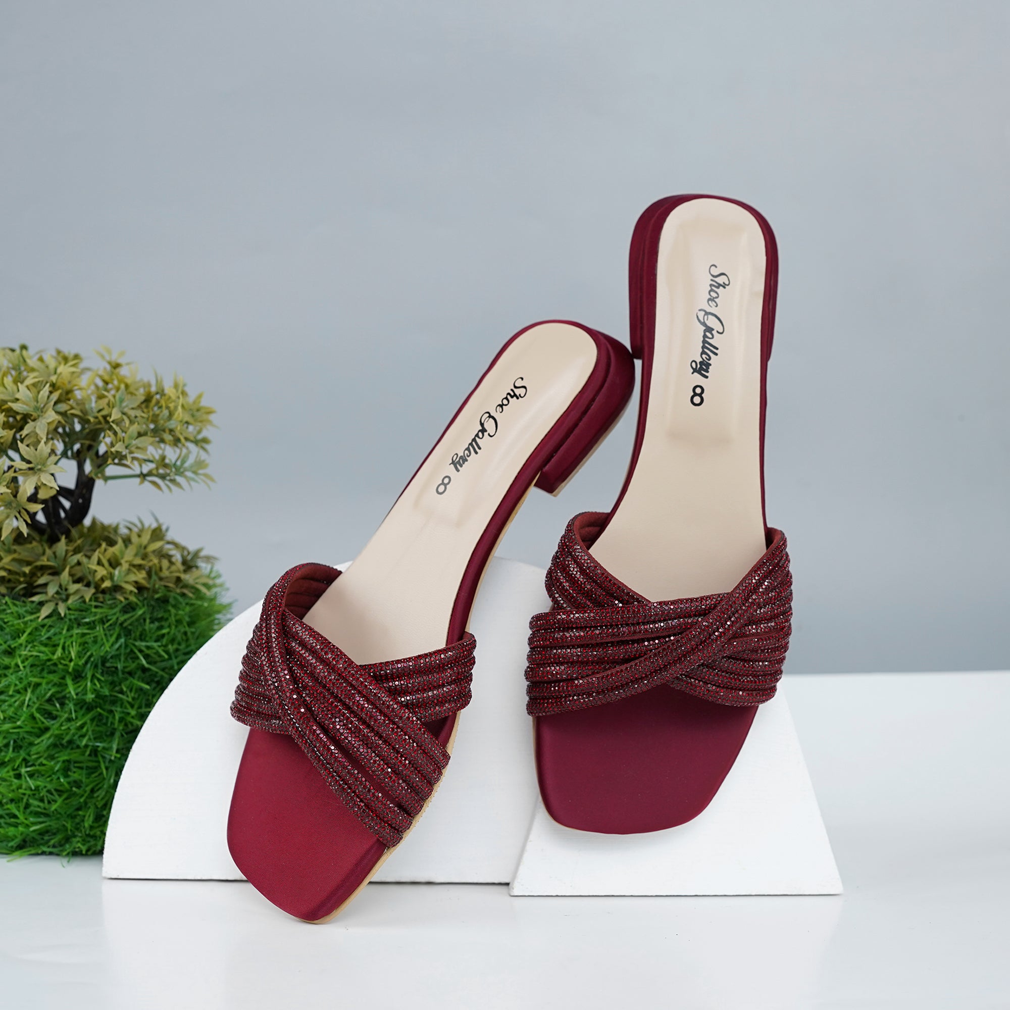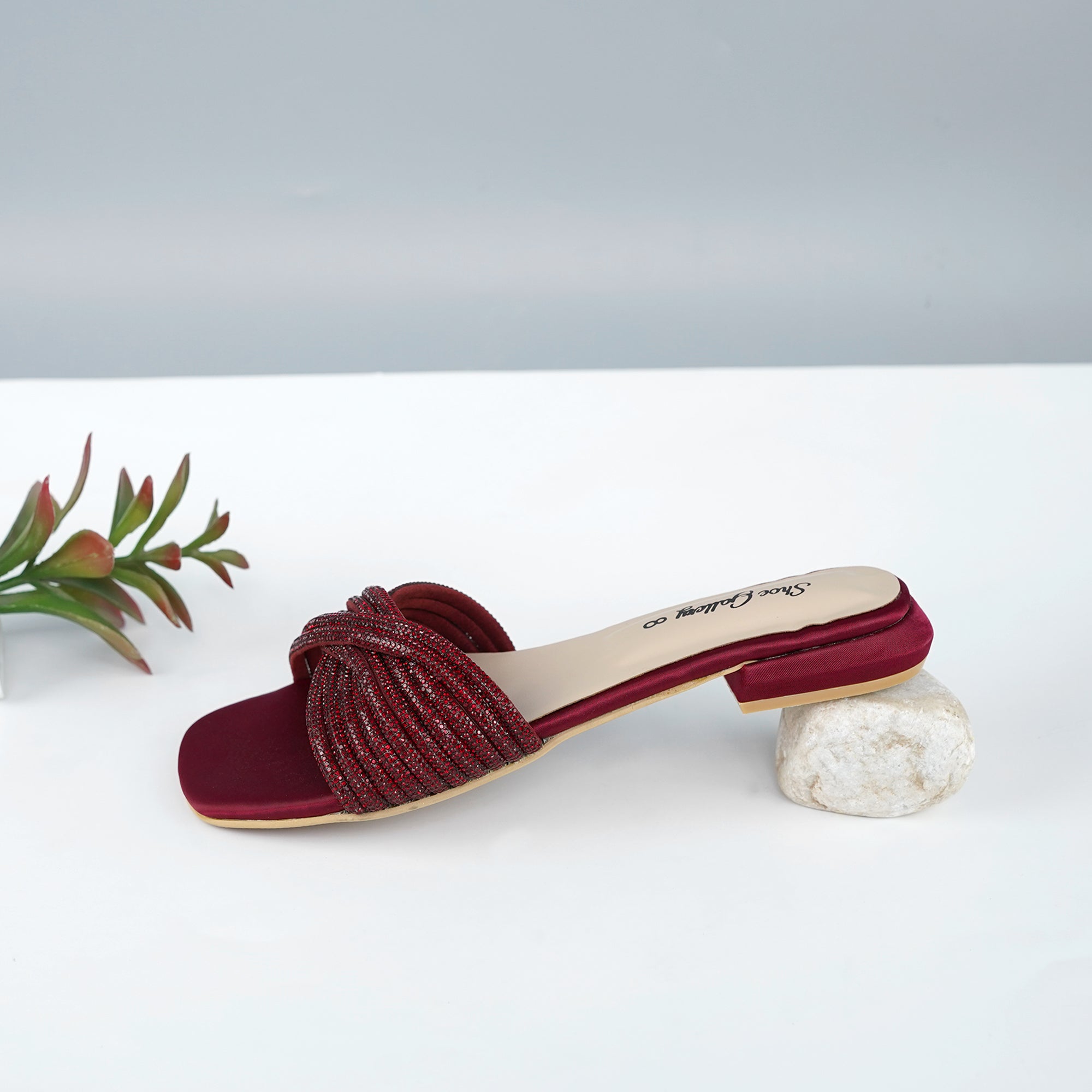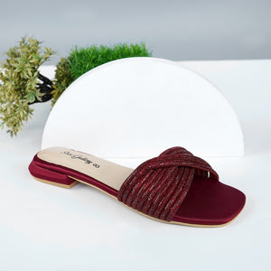 Turn every step into a statement with our Maroon Metallic Cross-Strap Flats. These chic slip-ons feature shimmering metallic straps intricately woven in a cross pattern over a rich maroon base, blending elegance with everyday comfort.