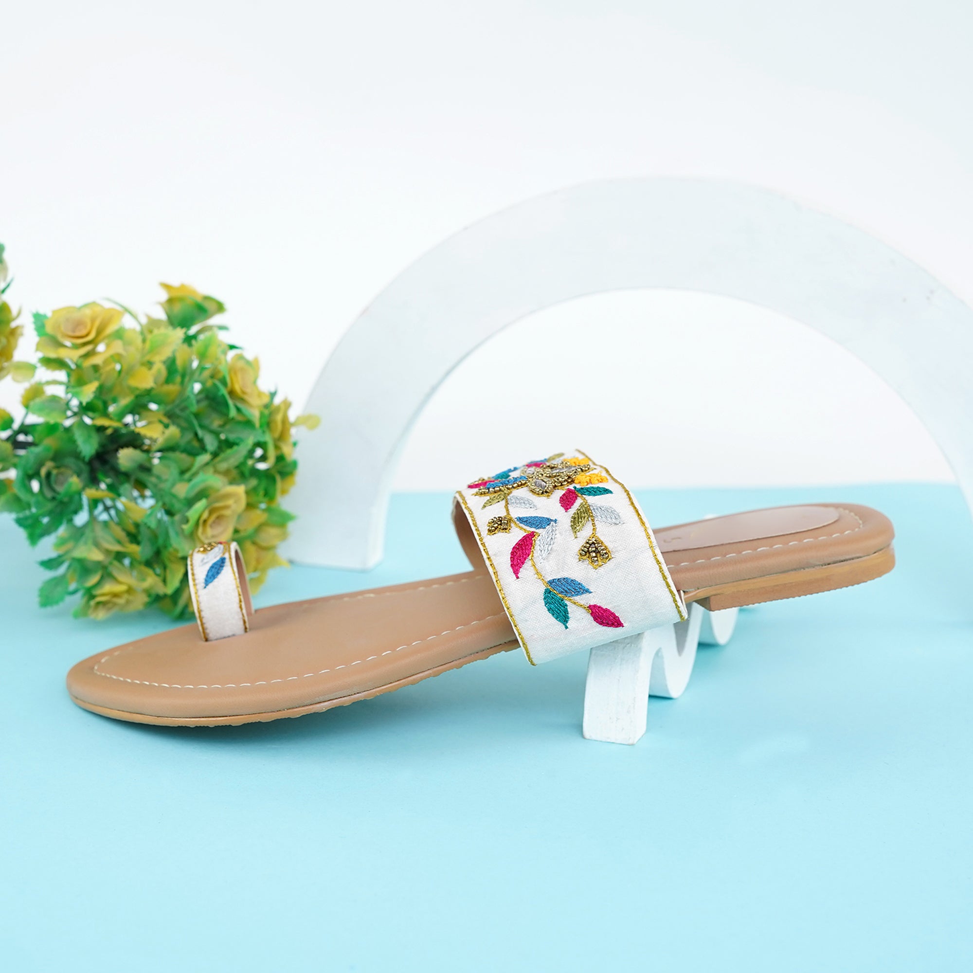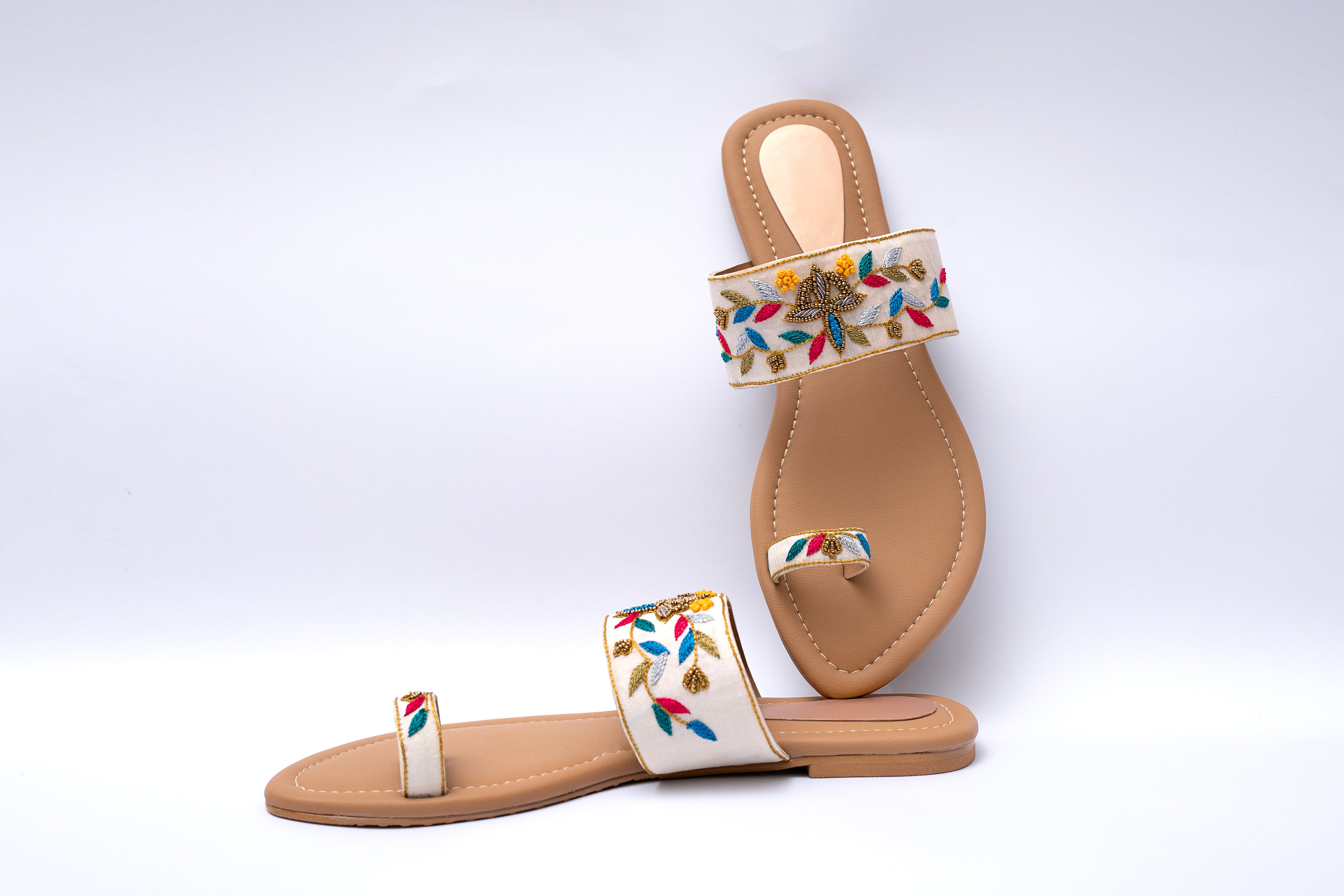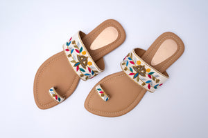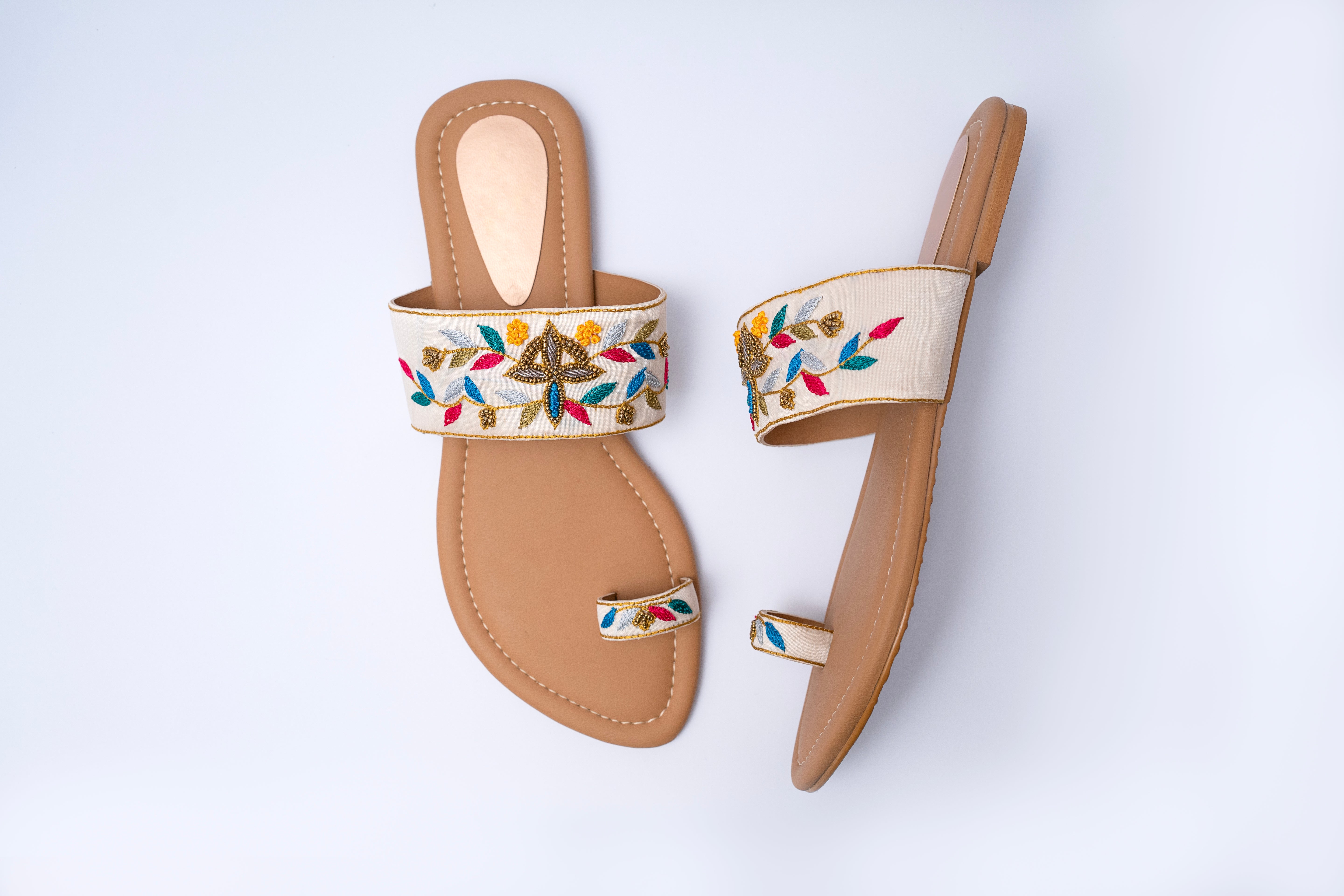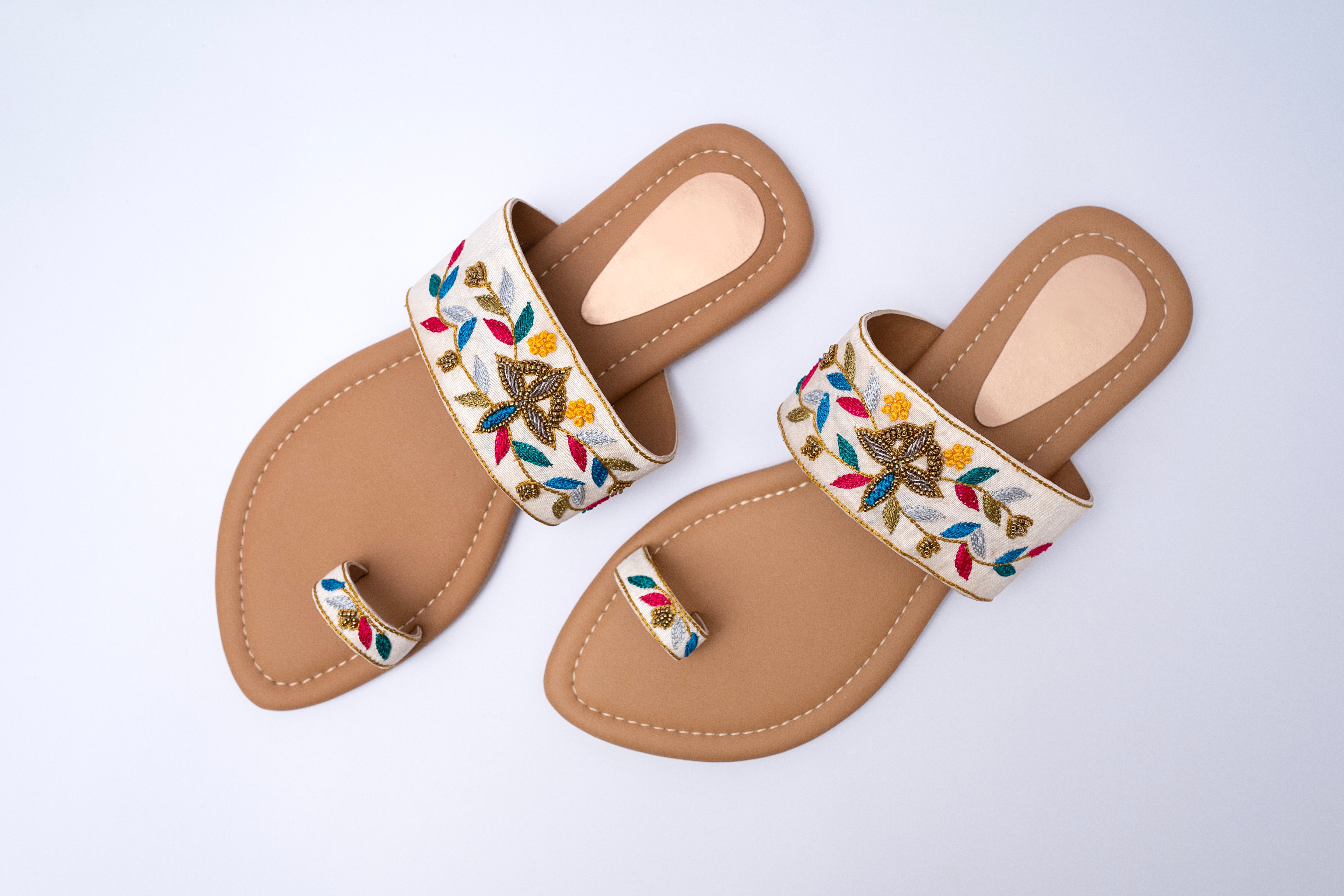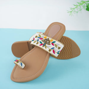 Step into style with our Embroidered Ethnic Kolhapuri Flats, a perfect blend of traditional artistry and modern comfort. These flats feature beautiful multicolor embroidery on a soft ivory base, detailed with intricate bead and thread work that adds a festive charm to your look.