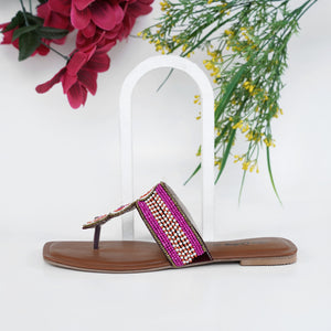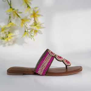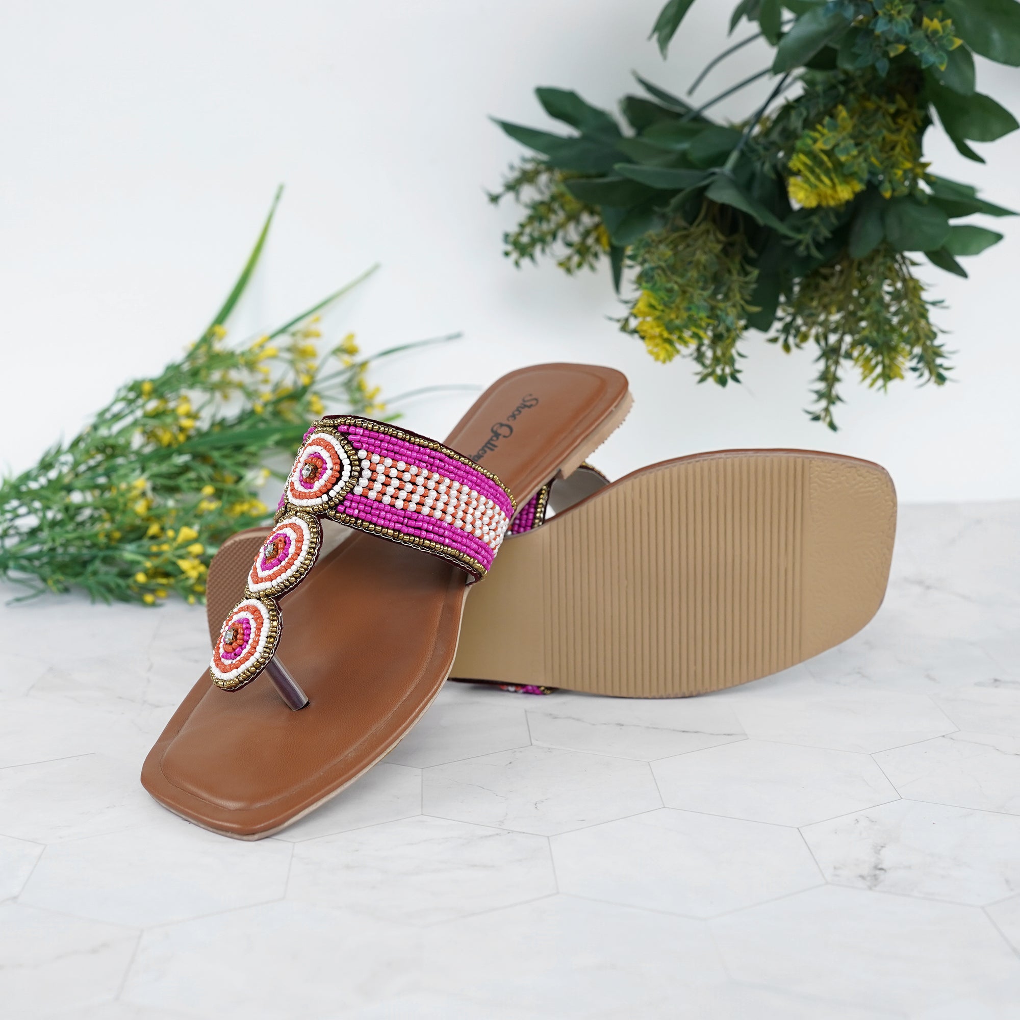 Add a pop of color and culture to your look with these stunning beaded flats. Designed with intricate hand-beaded detailing in shades of pink, white, orange, and gold, these sandals beautifully blend traditional artistry with modern fashion. The circular bead patterns give them a festive and eye-catching appeal, perfect for pairing with ethnic wear or adding flair to casual outfits.