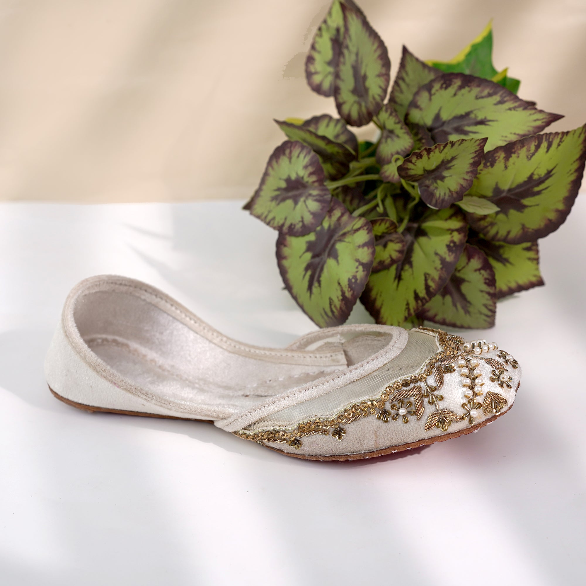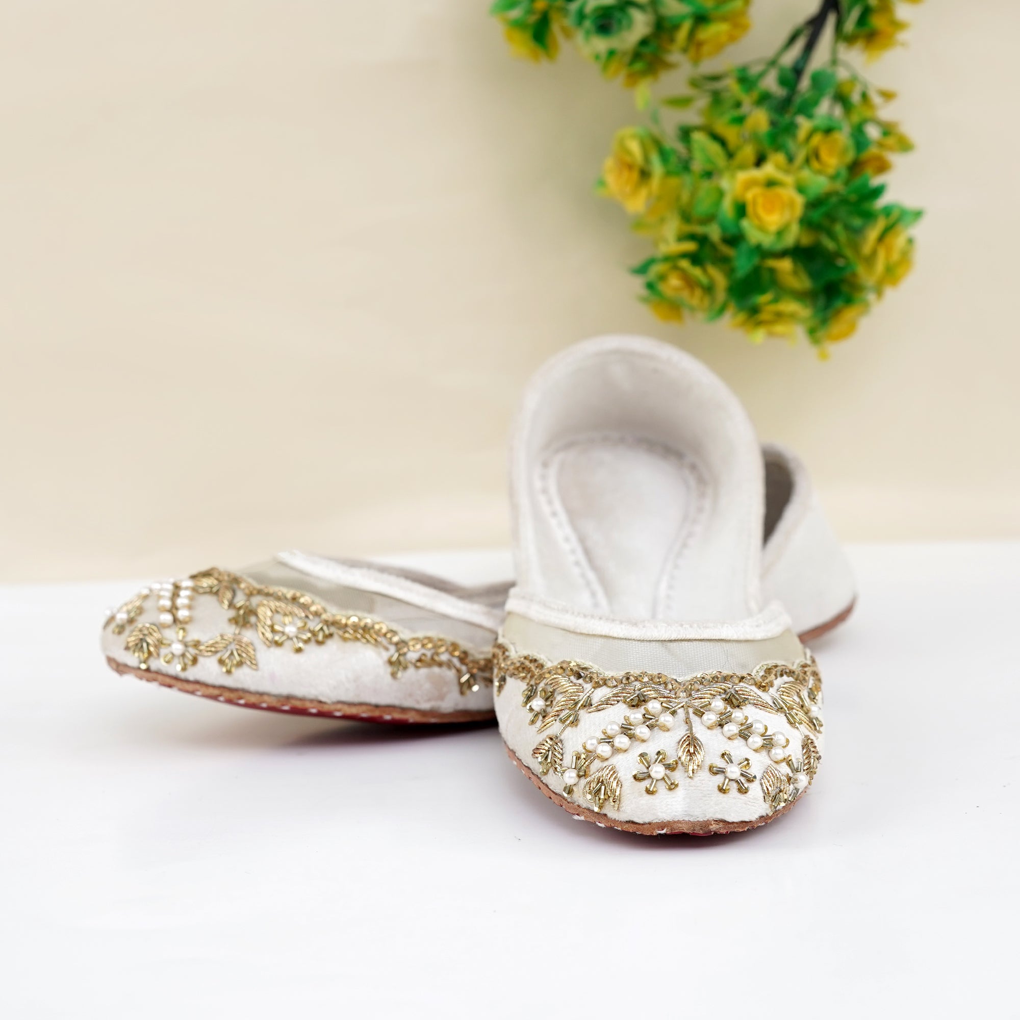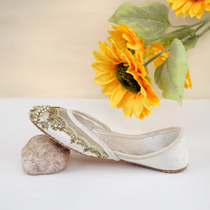 Step into sophistication with our Golden Grace Juttis, designed to bring a touch of royalty to every step you take. These stunning cream juttis feature exquisite golden threadwork, pearl embellishments, and intricate embroidery, creating a luxurious look perfect for festive and formal occasions.