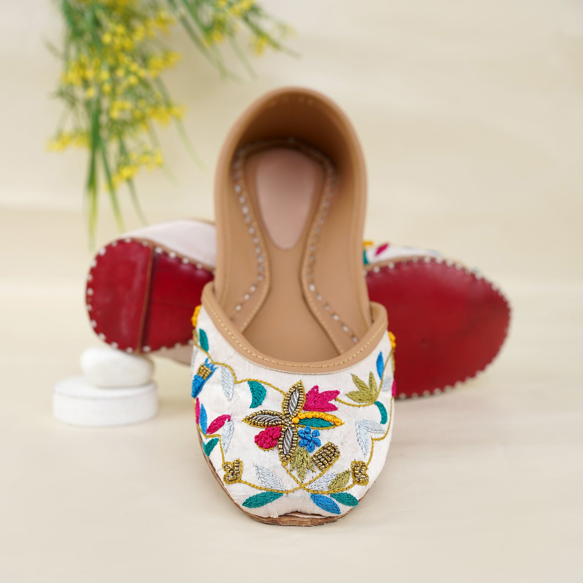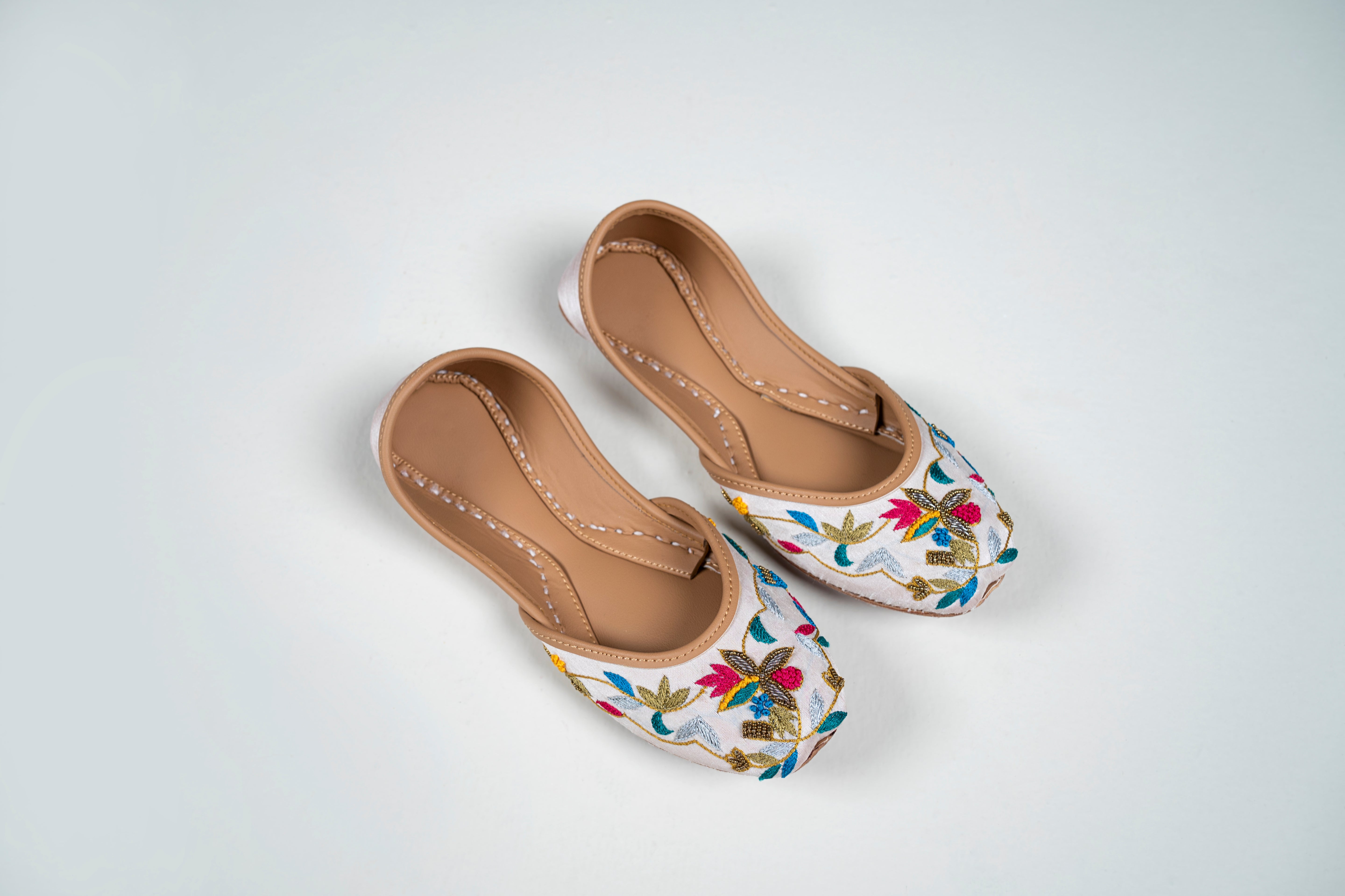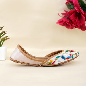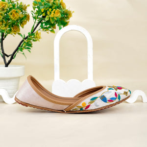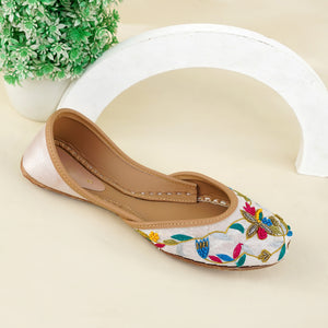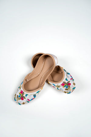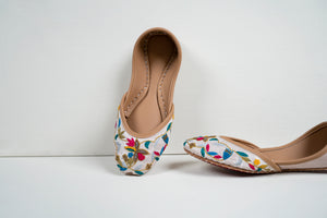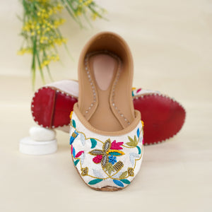 Add a pop of color and tradition to your wardrobe with our Floral Fiesta Juttis. These stunning handcrafted juttis feature intricate multicolor floral embroidery on a pristine white base, blending classic charm with contemporary flair.