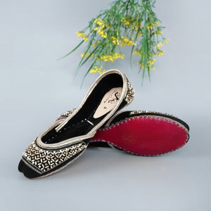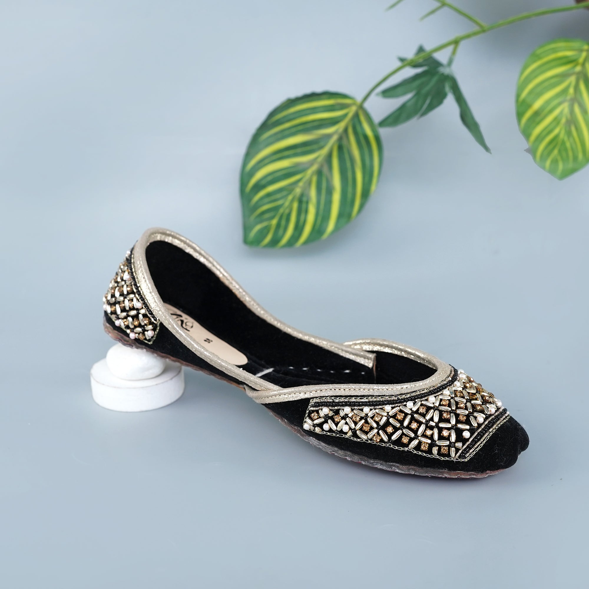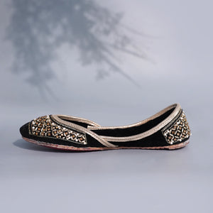 Step into pure elegance with our Golden Luxe Black Juttis, a stunning creation that blends timeless craftsmanship with modern sophistication. These juttis feature a rich black velvet base beautifully adorned with intricate golden bead and mirror work, adding the perfect sparkle to your festive or evening look.